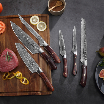 Cuchillo de carnicero japonés con mango de madera profesional para el hogar y la cocina, 6 uds., juego de cuchillos de Damasco personalizados hechos a mano